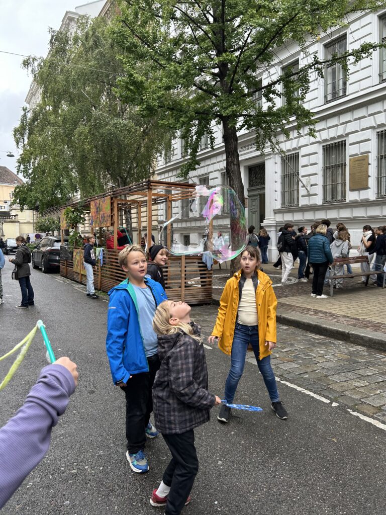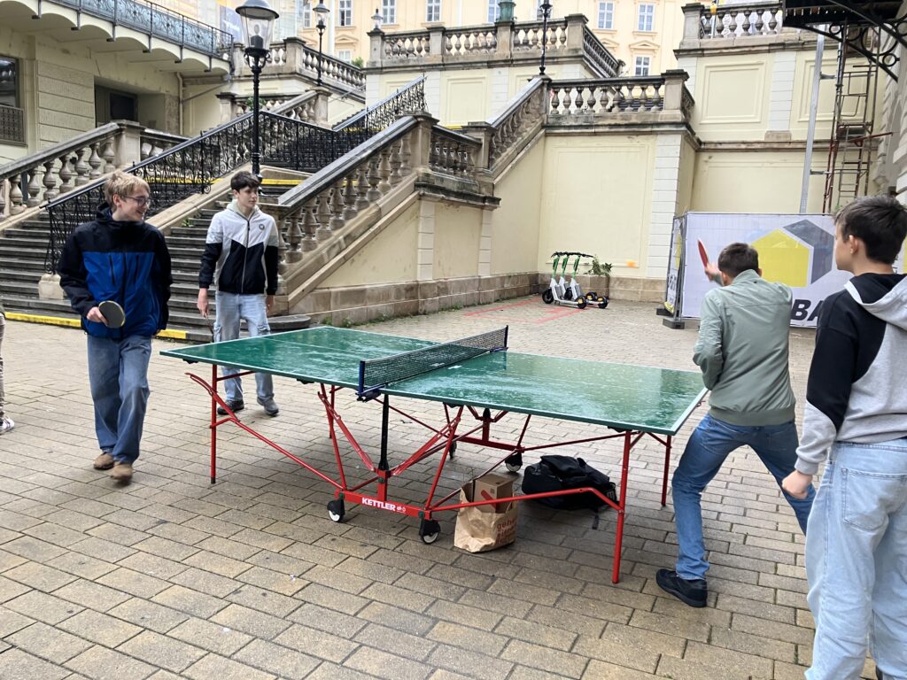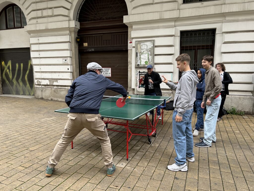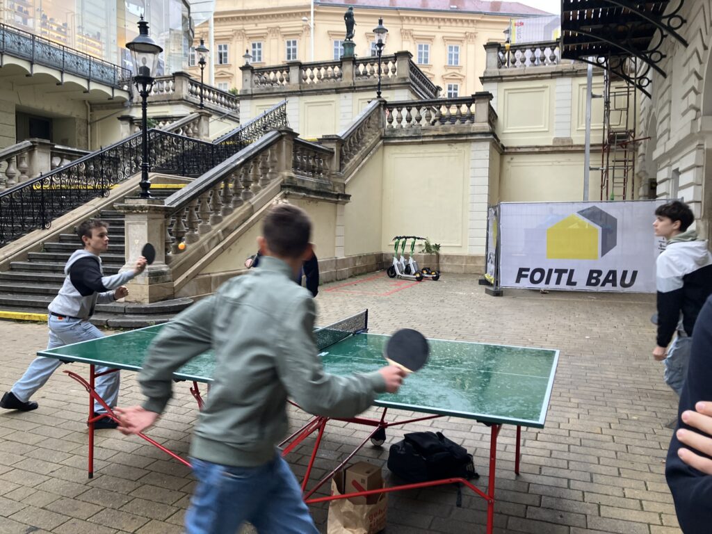 Am Freitag, den 26.9.25, nutzen viele Schüler:innen, aber auch einzelne Passant:innen, die Vorzüge einer autofreien Rahlgasse. Wo normalerweise 12 Autos parken, wurde Fußball und Tischtennis gespielt, getanzt und gesprungen, Seifenblasen verschickt, Müll richtig getrennt und nette Gesten durchgeführt (z.B. Geh zu einer Person mit Brille und sag: “Deine Brille steht dir super!”). Wegen des schlechten Wetters musste die Aufführung des Chors und der Auftritt des Rappers (Ben Jo) in den Musiksaal verlegt werden. In der Aula regte eine Timeline von Artist for Future zum Nachdenken an: “Wie schauen wissenschaftlich fundierte Zukunftsszenarien für unsere Erde aus?” Bei der Knüpfstation entstanden viele neue Freundschaftsbänder und beim Buffet des Maturaballkomitees konnte man gegen eine Spende eine köstliche Stärkung bekommen.