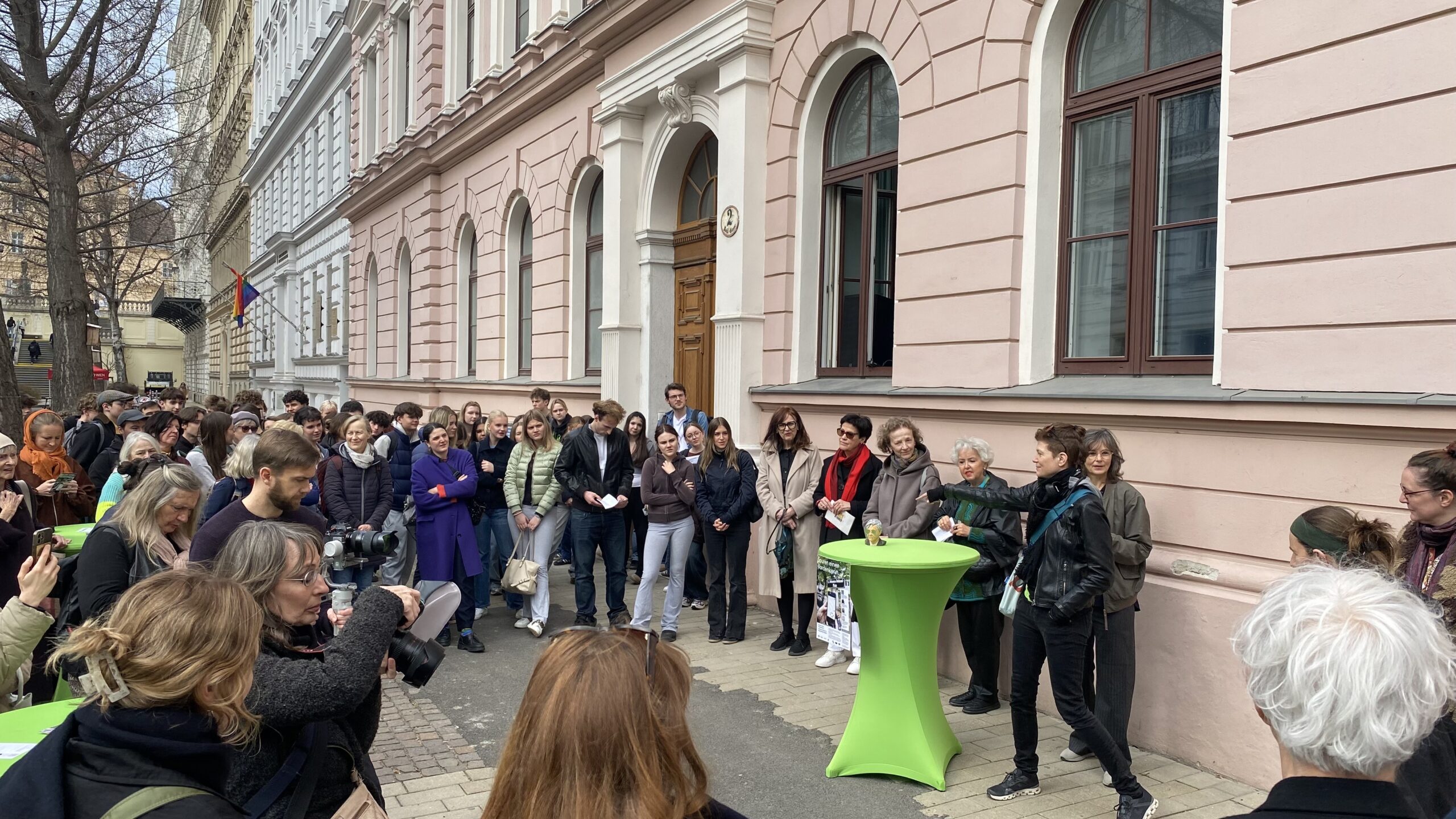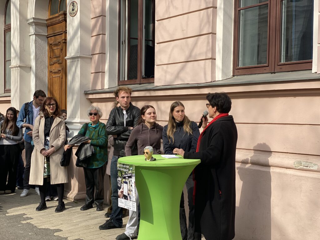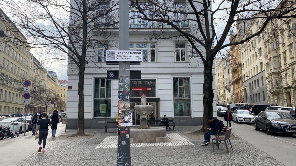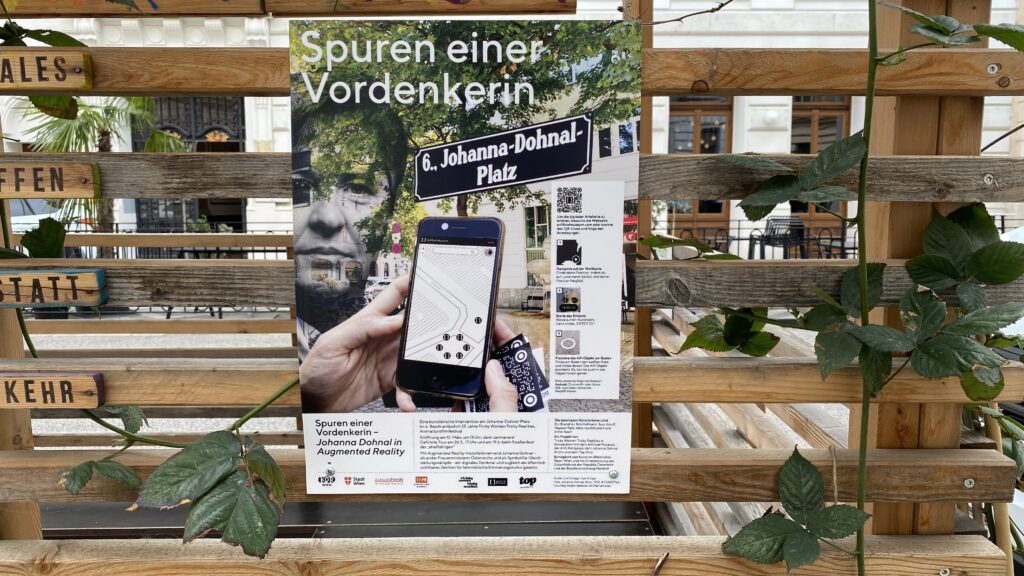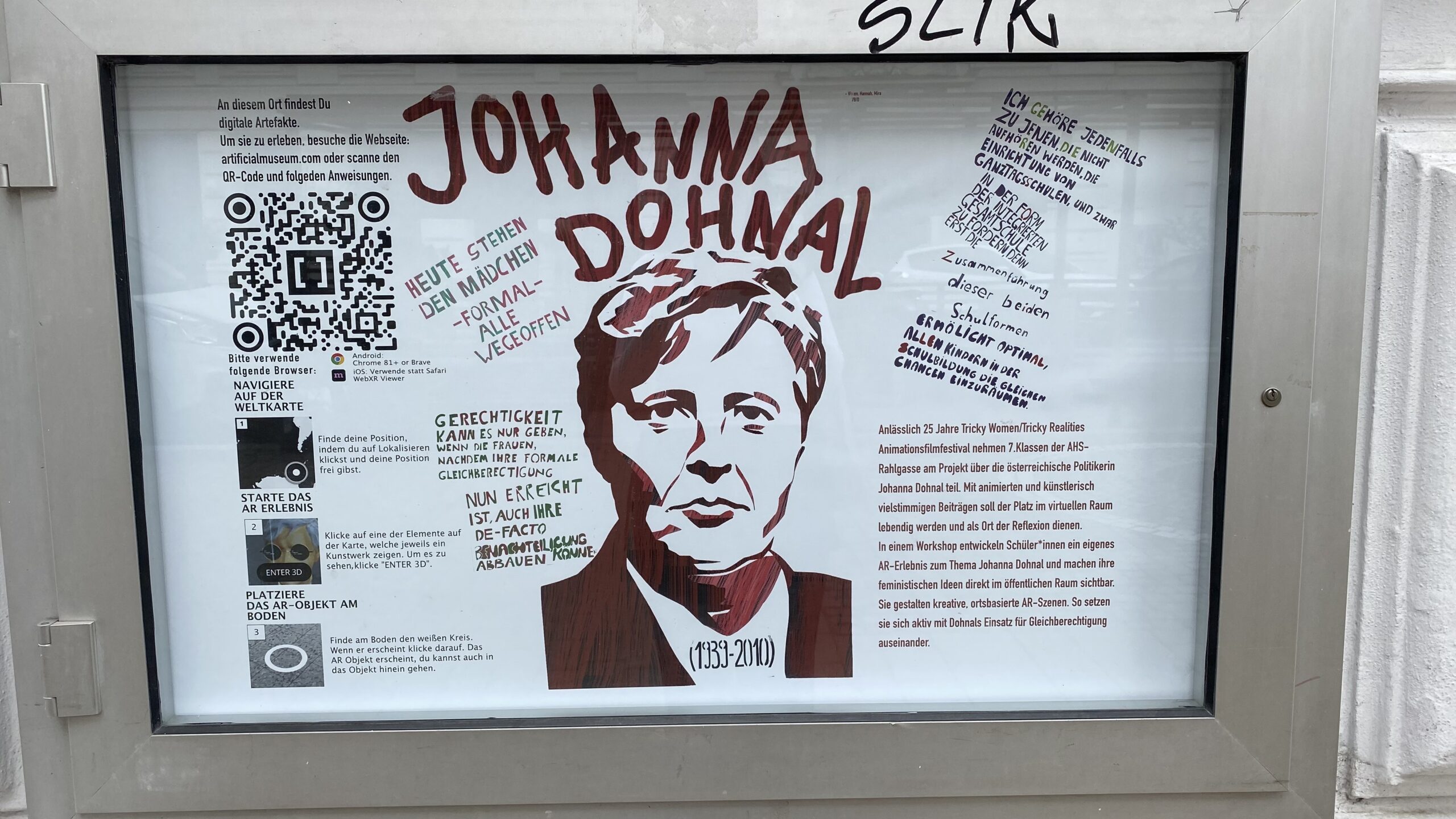 Anlässlich 25 Jahre Aninmationsfilmfestival „Tricky Women Tricky Realities“ wurden am 12. März 2026 am Johanna Dohnal-Platz und vor unserer Schule virtuelle Kunstinstallationen eröffnet, mit denen der ersten österreichischen Frauenministerin ein digitales Denkmal gesetzt wurde. Mit Augmented Reality-Artefakten wird ein öffentich sichtbares Zeichen für feministischische Erinnerungsarbeit realisiert. Die 7B und die 7E waren unter Anleitung sowohl ihrer Deutschlehrer:innen als auch ihrer Kunsterzieher:innen daran beteiligt und haben sich mit dem Leben und der Politik dieser einzigartigen Frau beschäftigt und unter Anleitung einer Künstlerin ihre Recherchen virtuell umgesetzt. Mithilfe der vor der Schule als auch am Johanna Dohnal-Platz angebrachten QR-Codes inklusive Anleitung sind die AR-Installationen dauerhaft zu betrachten.