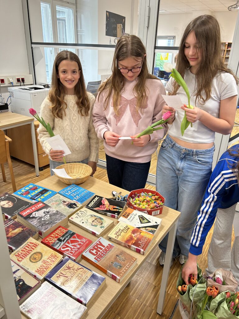 Um gemeinsam den Tag des Buches (und den Shakespeare-Tag) zu feiern, luden wir unsere Schüler*innen herzlich in die Bibliothek ein. Dort gab es zur Feier des Tages nicht nur neuen Lesestoff, sondern auch eine Tulpe und eine süße Überraschung. Ein besonderes Highlight war unser englischer Bücherflohmarkt, bei dem viele Werke ein neues Zuhause finden konnten. Wir haben uns sehr über die zahlreichen begeisterten Besucher*innen gefreut!